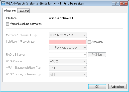 Standardmäßig ist für alle logischen WLANs eine Verschlüsselung aktiviert. In Public Spot-Anwendungen werden die Nutzdaten zwischen den WLAN-Clients und dem Access Point üblicherweise unverschlüsselt übertragen. Deaktivieren Sie daher unter Wireless-LAN > Verschlüsselung > WLAN-Verschlüsselungs-Einstellungen die Verschlüsselung für das logische WLAN, welches Sie zuvor für die Public Spot-Anmeldung freigegeben haben.