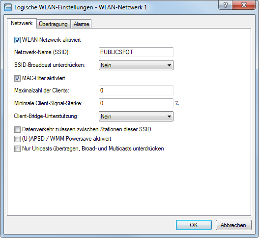 Aktivieren Sie das logische WLAN, welches Sie zuvor für die Public Spot-Anmeldung freigegeben haben, und geben Sie diesem Netzwerk einen aussagekräftigen Namen (SSID).