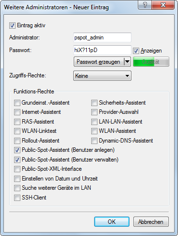 Da die Rechte zur Verwendung der Public Spot-Assistenten getrennt von einander konfigurierbar sind, lässt sich ein beschränkter Administrator auch auf einen einzelnen Assistenten einschränken. Im Falle des Benutzer-Erstellungs-Assistenten leitet das Gerät den beschränkten Administrator nach dem WEBconfig-Login dann automatisch an die entsprechende Eingabemaske weiter.
