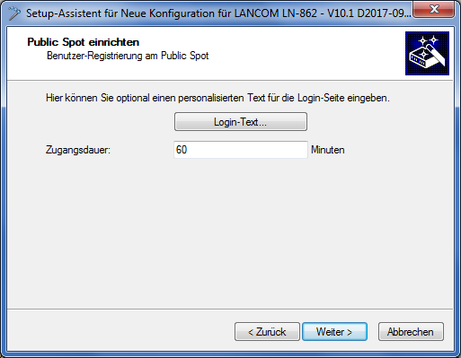 Wählen Sie hier optional einen Login-Text, legen Sie die Zugangsdauer fest und klicken Sie Weiter.