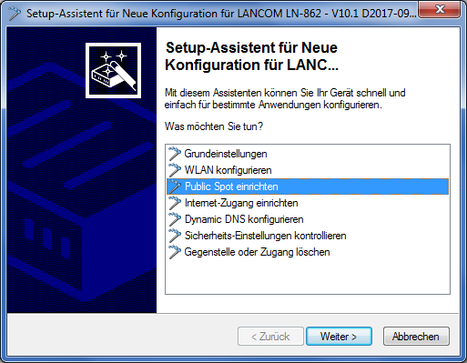 Starten Sie den Setup-Assistenten über , wählen Sie die Aktion Public Spot einrichten und klicken Sie anschließend auf Weiter.