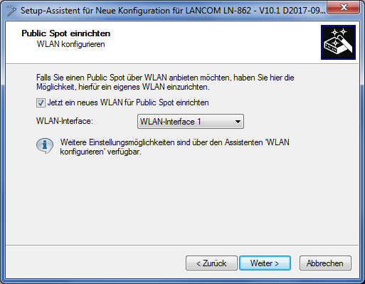 Falls Sie die Nutzung des Public Spots über WLAN einrichten möchten, aktivieren Sie die entsprechende Option und klicken Sie auf Weiter.