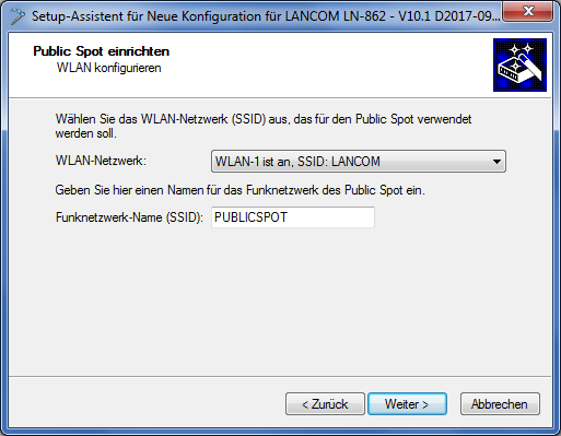 Wählen Sie aus dem Auswahlmenü die logische Schnittstelle aus, über die Sie den Public Spot anbieten wollen (z. B. WLAN-1), und geben Sie dem Funknetzwerk einen aussagekräftigen Namen (PUBLICSPOT). Klicken Sie auf Weiter.