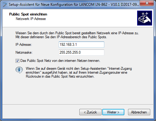 Anmerkung: Sofern Ihr Gerät nicht direkt mit dem Internet verbunden ist und Sie für Ihr Public Spot-Netzwerk einen anderen Adresskreis aufgespannt haben,