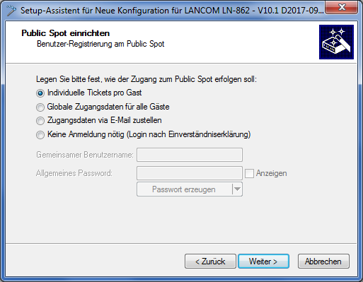 Sie können jedem Benutzer entweder eigene Zugangsdaten aushändigen oder ein allgemeines Konto einrichten, das sämtliche Benutzer für den Zugang zum Public Spot verwenden. Sofern Sie später Voucher ausgeben und feste Benutzerkonten einrichten möchten, wählen Sie die Option