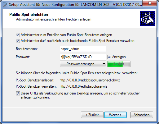 Erstellen Sie ggf. einen Administrator mit beschränkten Rechten, der über die Setup-Wizards in WEBconfig Public Spot-Nutzer erstellen und verwalten darf. Klicken Sie anschließend auf Weiter.