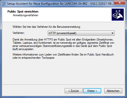 Anmerkung: Der Assistent für die Basis-Konfiguration des Public Spots zeigt je nach Gerätetyp und Verlauf verschiedene Dialoge. Dieses Tutorial stellt nur ein mögliches Beispiel dar.