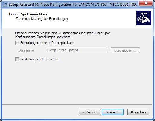 Klicken Sie abschließend auf Weiter und Fertig stellen, um die Basis-Installation des Public Spots abzuschließen. Der Setup-Assistent sendet die Einstellungen daraufhin an das Gerät.