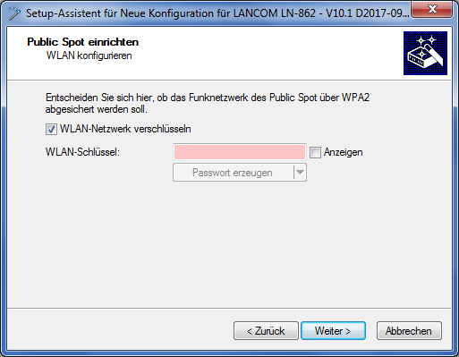 Legen Sie fest, ob das Funknetzwerk verschlüsselt werden soll. Geben Sie in diesem Fall einen WLAN-Schlüssel vor oder lassen Sie ihn automatisch generieren.