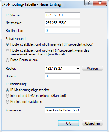 Wie Sie eine Rückroute einrichten, entnehmen Sie bitte der Dokumentation Ihres Internet-Gateways. In LANconfig konfigurieren Sie diese unter . Legen Sie dazu einen neuen Eintrag an und tragen Sie unter IP-Adresse die Netzadresse Ihres Public Spot-Netzes ein sowie unter Router die Adresse, die der Public Spot in Ihrem lokalen Netz besitzt.