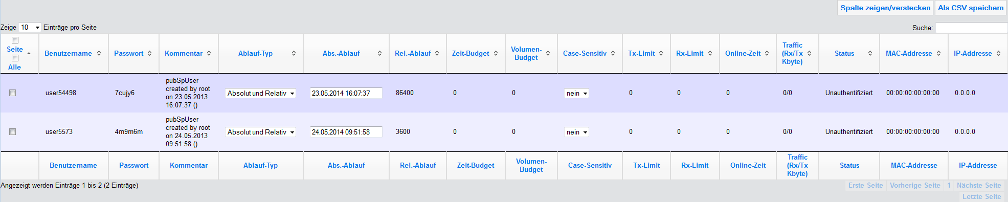 Der folgende Abschnitt beschreibt die Verwaltung von registrierten Public Spot-Benutzern über WEBconfig.