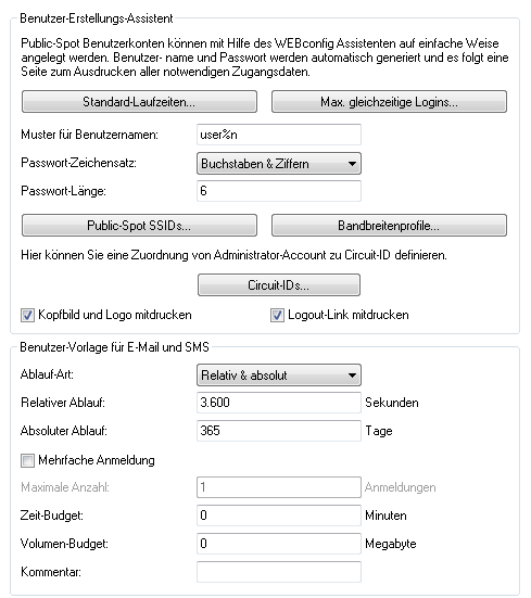 Der nachfolgende Abschnitt beschreibt, wie Sie die Standardwerte für den Benutzer-Erstellungs-Assistenten (Setup-Wizard Public-Spot-Benutzer einrichten) an Ihre Bedürfnisse anpassen. Die hier definierten Werte stehen einem Public Spot-Administrator beim Einrichten neuer Benutzer und Voucher-Druck anschließend als Auswahlwerte zur Verfügung (Laufzeiten, Bandbreitenprofile, etc.).