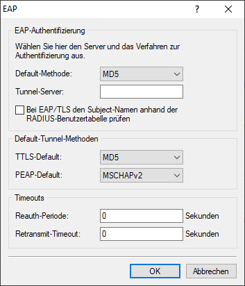 Die Konfiguration der EAP-Authentifizierung erfolgt über RADIUS > Server > Erweiterte Einstellungen > EAP