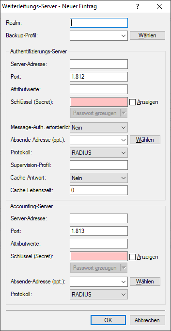 - Für den Port muss die gleiche Port-Nummer eingestellt werden, die im entsprechenden RADIUS-Server konfiguriert ist. Das ist im Allgemeinen 1812 für Zugangsverwaltung (Access) und 1813 für Abrechnung (Accounting).