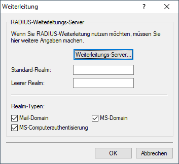 - Dieser Realm wird verwendet, wenn ein Realm übermittelt wird, für den kein expliziter Weiterleitungs-Server definiert ist. Für den Standard-Realm selbst muss in der Weiterleitungs-Tabelle allerdings ein entsprechender Eintrag angelegt werden.