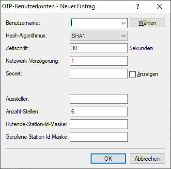 Geben Sie hier den Namen des OTP-Benutzers ein. Dieser muss in der Tabelle RADIUS-Benutzerkonten bereits mit gleichem Namen enthalten sein.