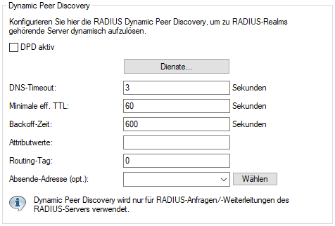 Unterstützung für das RFC 7585 "Dynamic Peer Discovery for RADIUS/TLS and RADIUS/DTLS Based on the Network Access Identifier (NAI)". Statt RADIUS-Requests statisch zu einem oder mehreren RADIUS-Servern weiterzuleiten ermöglicht Dynamic Peer Discovery dynamisch anhand des Realms / NAIs den richtigen RADIUS-Server zu finden. Kommt ein Request, so wird per DNS NAPTR/SRV-Record der richtige Server gefunden.