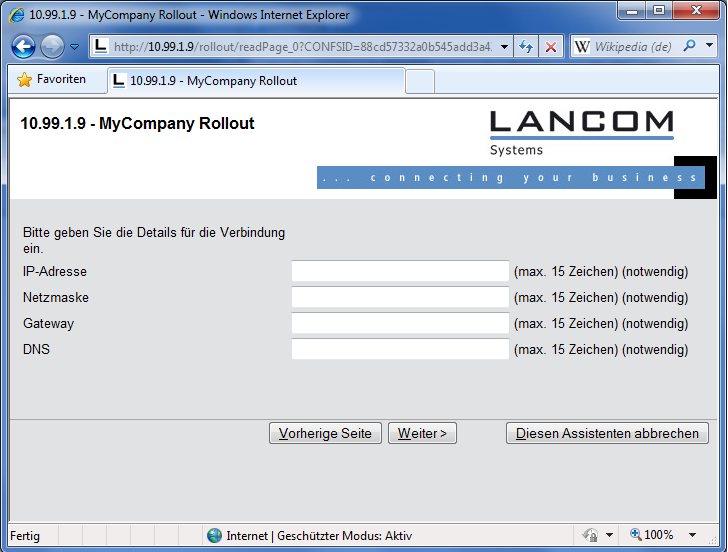 Auf dieser Seite fragt der Assistent vom Benutzer die Werte für die IP-Adresse, die Netzmaske, das Gateway und den DNS-Server ab. Alle Felder sind für die Ausführung des Assistenten notwendig.