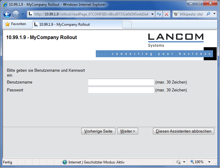 Auf dieser Seite fragt der Assistent vom Benutzer den Benutzernamen und das Passwort mit einer Länge von jeweils maximal 30 Zeichen ab.