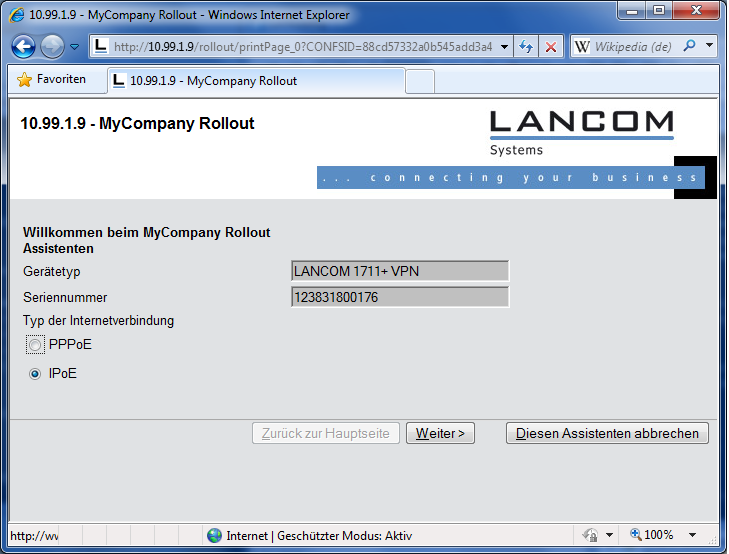 Die Sektion 'Start' zeigt zunächst einen statischen Text zur Begrüßung an. Darunter zeigt der Assistent in zwei Read-Only-Feldern den Gerätetyp und die Seriennummer an. Der Assistent liest diese beiden Werte beim Öffnen der Seite über den Bereich on_show aus dem Gerät aus. In einer Optionsliste bietet der Assistent dem Benutzer die Auswahl für einen Internetzugang über 'PPPoE' oder 'IPoE' an. Da keine Werte für die Optionsfelder definiert sind, setzt der Assistent die Variable select_inet je nach Auswahl des Benutzers für PPPoE auf '0' und für IPoE auf '1'.