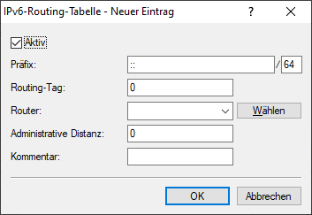 - Tragen Sie hier als Präfix inkl. Präfixlänge den Netzbereich ein, dessen Daten die aktuelle Gegenstelle erhalten soll, z. B. 2001:db8::/32. Der Wert ::/0 bezeichnet die Default-Route.