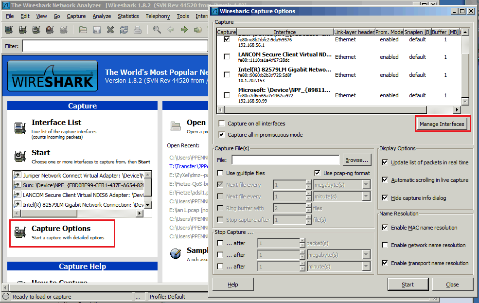 2. Wählen Sie auf dem Startbilschirm Capture Options aus. Klicken Sie im darauf erscheinenden Fenster auf die Schaltfläche Manage Interfaces.
