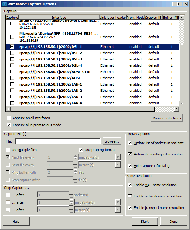 5. Wählen Sie in den Capture Options aus, welche Schnittstellen erfasst werden sollen. Klicken Sie anschließend auf die Schaltfläche Start.
