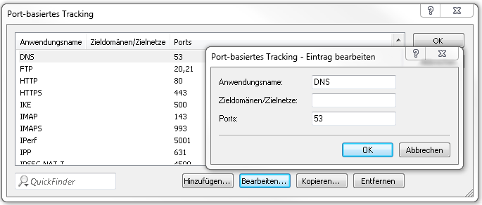 Die Layer-7-Anwendungserkennung beobachtet den Ziel-Port einer Anwendung. Wird eine Verbindung über Port 80 oder 443 (HTTP oder HTTPS) erkannt, erfolgt eine weitere Analyse des Verbindungsaufbaus. Weicht der Ziel-Port davon ab, erfolgt die Zuordnung der Verbindung Port-abhängig über die in der Liste "Port-basiertes Tracking" festgelegten Anwendungen.