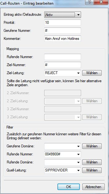 Die Signalisierung ankommender Rufe von z. B. kostenpflichtigen Hotlines (0900) lässt sich durch die folgende Call-Route unterbinden: