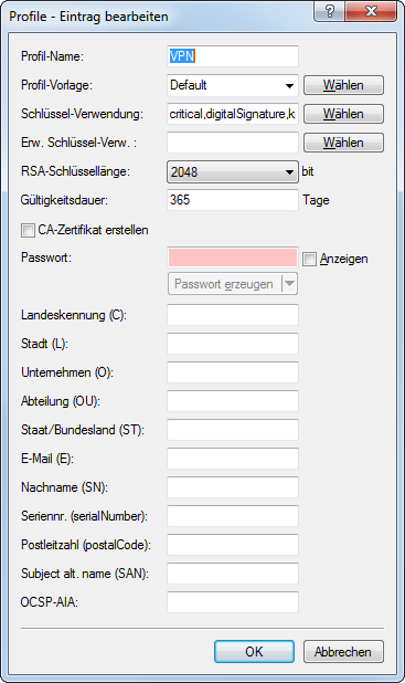 - Wählen Sie hier ggf. eine passende Profil-Vorlage aus. In der Profil-Vorlage ist festgelegt, welche Zertifikatsangaben notwendig und welche änderbar sind. Die Vorlagen-Erstellung erfolgt unter .