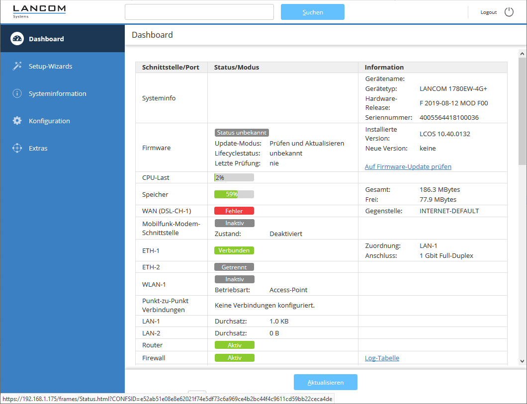 Hier finden Sie umfangreiche Informationen über den aktuellen Betriebszustand des Gerätes. Dazu gehört z. B. die visuelle Darstellung der Schnittstellen mit Angabe der darauf aktiven Netzwerke. Über entsprechende Links können relevante weitere Statistiken aufgerufen werden (z. B. DHCP-Tabelle). Bei wesentlichen Mängeln in der Konfiguration (z. B. ungültige Zeiteinstellung) wird ein direkter Link zu den entsprechenden Konfigurationsparametern angeboten.