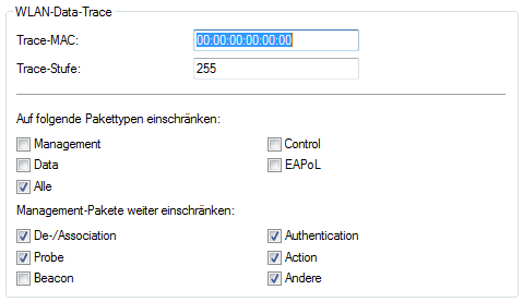 - Mit dieser Auswahl lässt sich einstellen, welche Klassen von Management-Frames im WLAN-DATA-Trace auftauchen sollen.