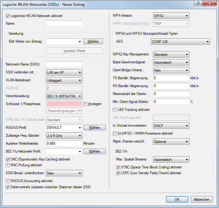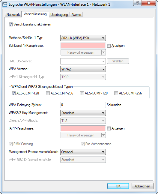 - Das WLAN-Interface unterstützt PMF. Die WLAN-Management-Frames sind je nach PMF-Unterstützung des WLAN-Clients verschlüsselt oder unverschlüsselt.