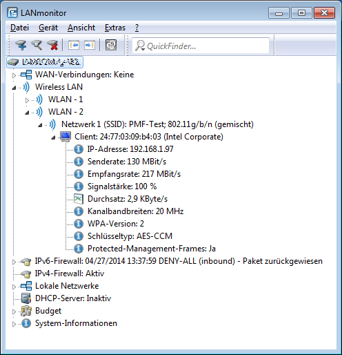Der LANmonitor zeigt unterhalb des entsprechenden Clients an, ob dieser die WLAN-Management-Frames verschlüsselt.