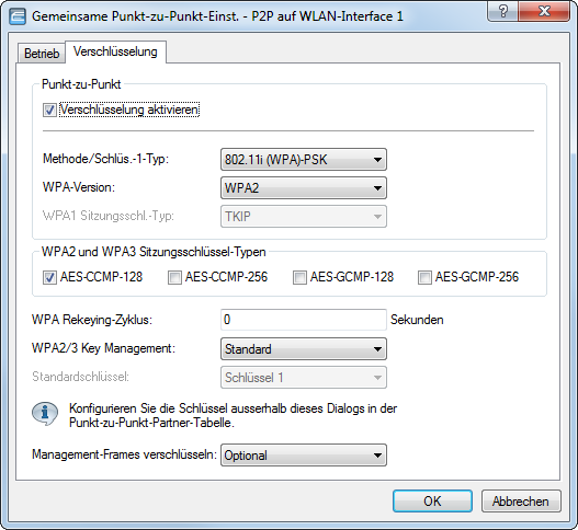 Um die Management-Frames bei P2P-Verbindung zwischen den Basisstationen zu verschlüsseln, wechseln Sie in LANconfig in die Ansicht , öffnen die P2P-Konfiguration der entsprechenden WLAN-Schnittstelle, wechseln auf den Reiter Verschlüsselung und wählen in der Auswahlliste Management-Frames verschlüsseln die entsprechende Option.