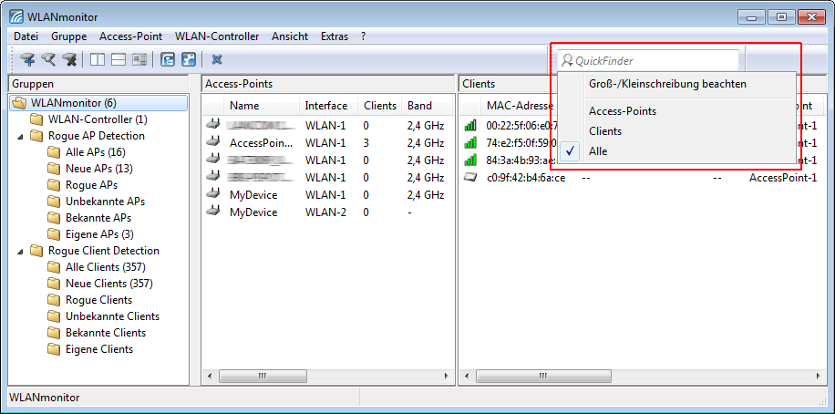 Der WLANmonitor erfasst sowohl Access Points als auch WLAN-Clients. Mit einem Klick auf die Lupe am linken Rand des Suchfensters öffnen Sie ein Kontextmenü zur Auswahl des Suchumfangs. Wählen Sie je nach Anwendung nur die Access Points, nur die Clients oder alle Einträge aus.