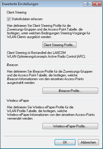 Um die Einstellungen von Wireless-ePaper-Informationen und iBeacon-Informationen der einzelnen APs komfortabel über einen WLC zu verwalten, erstellen Sie über WLAN-Controller > AP-Konfiguration mit der Schaltfläche Erweiterte Einstellungen die entsprechenden Profile für Wireless-ePapaper und iBeacon.