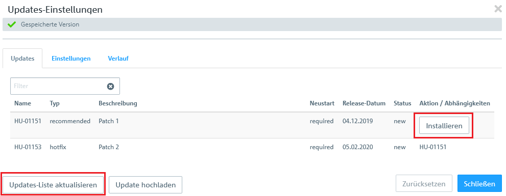 - Hat die Unified Firewall ein neues Update bereits über ihren automatischen Suchmechanismus (siehe Registerkarte Einstellungen) gefunden, wird dieses in der Liste angezeigt und kann mit einem Klick auf die Schaltfläche Installieren durchgeführt werden.