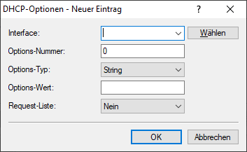 - Definiert, ob die Optionsnummer im DHCP-Request angefragt werden soll. Das Verhalten wird über das jeweilige RFC der DHCP-Option definiert. Mögliche Werte: Ja, Nein