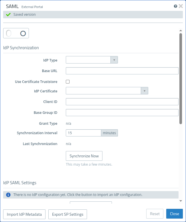 As of LCOS FX 11.2, the following changes to the SAML settings have been introduced for both the internal and external portal. New options are now available for using the certificate truststore, selecting an optional IdP certificate (formerly "IdP Certificate (PEM)"), and specifying a base group ID.