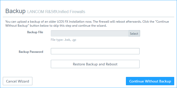 The setup wizard is then closed, the configuration is restored from the backup, and the firewall restarts.