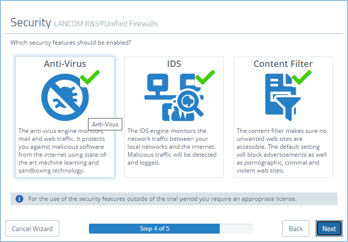 After being started for the first time, or following a re-installation, the LANCOM R&S®Unified Firewall runs for 30 days as a demo version. You cannot perform a backup during the trial period. At the end of the trial period, the firewall will retain your configuration. The UTM features will be disabled and you can no longer save any changes.