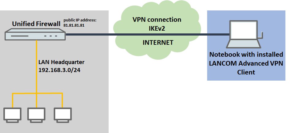 - The company headquarters has a LANCOM R&S®Unified Firewall as a gateway with an Internet connection with the fixed public IP address 81.81.81.81.