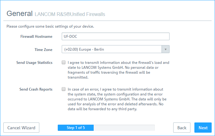You can optionally allow information about the firewall’s load and state to be recorded and sent to LANCOM Systems GmbH. No personal information or any of the firewall traffic will be transmitted.