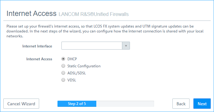 With the exception of the language selection at the start of the setup wizard, you can cancel the wizard at any time with the Cancel Wizard button. After canceling the wizard, you can continue with a manual setup following the steps Configuring the Internet Connection and Enabling Internet Access.