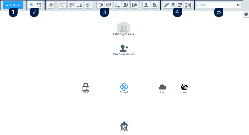 The desktop (3) fills the main portion of the screen below the header area and to the right of the navigation pane. The highlighted nodes and connections depend on the item selected in the navigation pane or on the desktop.