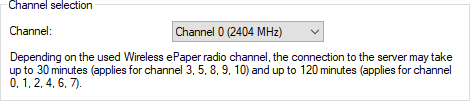 Depending on the radio channel used, connecting the server to a Display can take up to 30 minutes (channels 3, 5, 8, 9, 10) or up to 120 minutes (channels 0, 1, 2, 4, 6, 7). If possible, you should prefer the channels 3, 5, 8, 9 and 10, as Wireless ePaper Displays scan them more frequently and they do not interfere with the popular Wi‑Fi channels 1, 6, and 11.