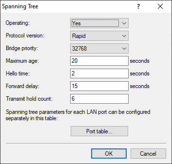 Note: When using RSTP, the forwarding delay often has no effect, as RSTP has built-in mechanisms to trigger a fast transition to the forwarding state.Note: Modifying this time value is recommended only with a thorough understanding of the Spanning Tree Protocol. Adjustments may be useful to optimize response times to topology changes or to ensure stable operation in networks with many "bridge hops".