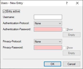 Individual users can be granted access to the device in addition to the administrators registered on it. Here you configure the authentication and encryption settings for these users when operating SNMPv3.