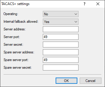 If this feature is active, admin logins are checked against the TACACS+ server and displayed and changed configuration items are transferred to the TACACS+ server for approval and/or logging.
